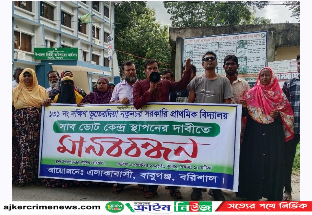বরিশালের বাবুগঞ্জ উপজেলার কেদারপুর ইউনিয়নের ৯ নম্বর ওয়ার্ডের দক্ষিণ ভুতেরদিয়া নতুনচর এলাকার ভোটাররা সাব-ভোটকেন্দ্র স্থাপনের দাবিতে বাবুগঞ্জ উপজেলা নির্বাচন কর্মকর্তার কার্যালয় ঘেরাও করে বিক্ষোভ কর্মসূচি ও মানববন্ধন করেছেন।