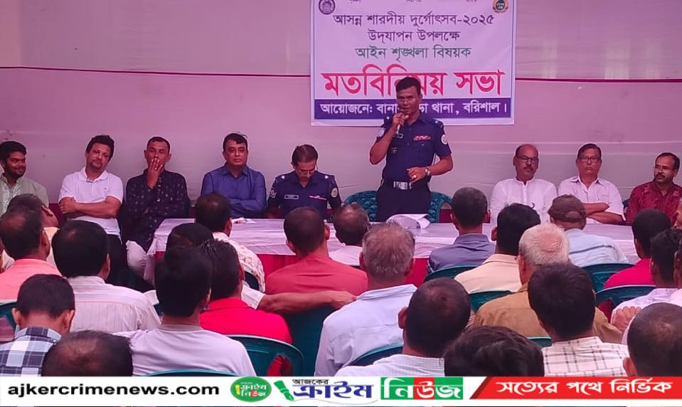 বরিশালের বানারীপাড়ায় সনাতন ধর্মালম্বীদের প্রধান ধর্মীয় উৎসব শারদীয় দুর্গা পূজা উদযাপন উপলক্ষে আইন শৃঙ্খলা বিষয়ক মতবিনিময় সভা অনুষ্ঠিত হয়েছে। বৃহস্পতিবার (১১ সেপ্টেম্বর) বিকালে থানা চত্বরে এ সভা অনুষ্ঠিত হয়। বানারীপাড়া থানার অফিসার ইনচার্জ (ওসি) মোঃ মোস্তফার সভাপতিত্বে অনুষ্ঠিত এ মতবিনিময় সভায় অন্যান্যের মধ্যে বক্তৃতা করেন উপজেলা ইসলামী আন্দোলনের সভাপতি মাওলানা শীহাবউদ্দিন,উপজেলা জামায়াতের সেক্রেটারী মাওলা:না মোকাম্মেল হোসেন মোজাম্মেল,উপজেলা পূজা উদযাপন পরিষদের সভাপতি দেবাশীষ দাস, সাধারণ সম্পাদক গৌতম সমদ্দার,ছাত্র প্রতিনিধি সাব্বির হোসেন প্রমুখ। সভায় উপজেলার বিভিন্ন মন্দিরের সভাপতি ও সম্পাদকসহ নেতৃবৃন্দ উপস্থিত ছিলেন। থানার উপ-পরিদর্শক মোঃ কবির হোসেনের সঞ্চালনায় প্রাণবন্ত এ মতবিনিময় সভায় বানারীপাড়ায় সাম্প্রদায়িক সম্প্রীতি ও আইন শৃঙ্খলা সমুন্নত রেখে শান্তিপূর্ণ ও উৎসবমূখর পরিবেশে নির্বিঘ্নে আসন্ন দুর্গোৎসব উদযাপনে ওসি মোঃ মোস্তফা তার দূরদর্শী বক্তৃতায় বিভিন্ন দিকনির্দেশনা দেন এবং সংশ্লিষ্ট সবার সহযোগীতা কামনা করেন। ###