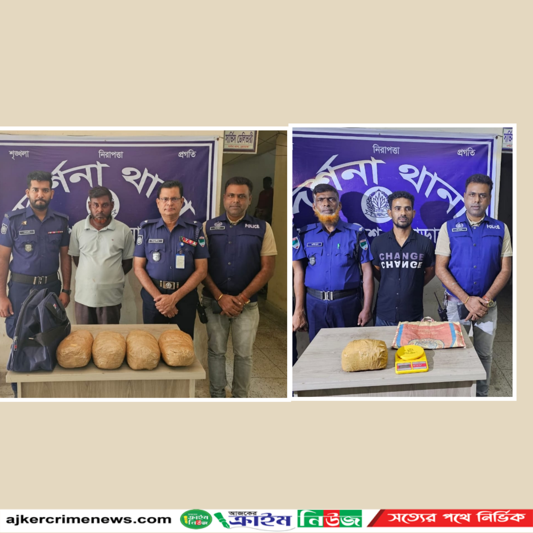 সোমবার সকাল সাড়ে ৯ টার দিকে দর্শনা থানার অফিসার ইনচার্জ মুহম্মদ শহীদ তিতুমীর এর তত্বাবধানে দর্শনা থানার এসআই (নিঃ) মোঃ মাসুদুর রহমান সঙ্গীয় ফোর্সসহ দর্শনা বাসষ্টান্ডে এক মাদক বিরোধী অভিযান চালায়।এসময় দর্শনা পৌর এলাকার সীমান্তবর্তী জয়নগর গ্রামের আজাদ আলীর ছেলে মোঃ মাগরিব আলী (৪৪) কে আটক করে।পরে তার হাতে থাকা ব্যাগ তল্লাশি করে ১লাখ ২০ হাজার টাকার মূল্যের ৪ কেজি অবৈধ নেশাজাতীয় মাদকদ্রব্য গাঁজা উদ্ধার করে। এছাড়া ভোররাতে এক অভিযান চালিয়ে ১ কেজি গাঁজা ও ১ টি ডিজিটাল পরিমাপক মেশিনসহ বাসস্ট্যান্ডপাড়া একটি টি স্টল এর সামনে থেকে দক্ষিণ চাদপুর গ্রামের খায়রুল ইসলামের ছেলে মোঃ রাশেদুল ইসলাম (৩৫) আটক করে।