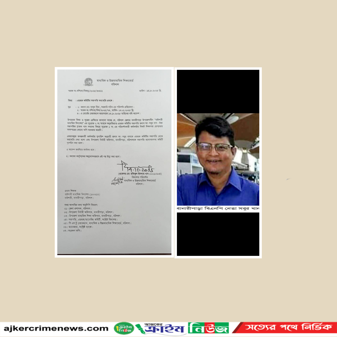 রাহাদ সুমন, বিশেষ প্রতিনিধি: অবশেষে বরিশালের বানারীপাড়ায় শিক্ষাগত যোগ্যতার মিথ্যা তথ্য দিয়ে উপজেলার বাইশারী মাধ্যমিক বিদ্যালয়ের সভাপতি হওয়া সেই বিএনপি নেতা সবুর খানকে অপসারন করা হয়েছে। তদন্ত প্রতিবেদনে অভিযোগের সত্যতা পেয়ে বরিশাল মাধ্যমিক ও উচ্চমাধ্যমিক শিক্ষা বোর্ডের চেয়ারম্যান প্রফেসর মো. ইউনুস আলী সিদ্দিকীর নির্দেশে বাইশারী মাধ্যমিক বিদ্যালয়ের ম্যানেজিং কমিটির সভাপতির পদ থেকে বিএনপি নেতা সবুর খানকে অপসারন করে চিঠি দেওয়া হয়েছে। বুধবার (১৫ অক্টোবর) সকালে বিদ্যালয়ের ভারপ্রাপ্ত প্রধান শিক্ষক মোস্তফা কামাল সভাপতি পদ থেকে সবুর খানকে বাদ দেওয়া সংক্রান্ত বোর্ডের চিঠি পাওয়ার তথ্য নিশ্চিত করেন। বোর্ডের বিদ্যালয় পরিদর্শক প্রফেসর মোঃ রফিকুল ইসলাম খান স্বাক্ষরিত ওই পত্রে সবুর খানকে বাদ দিয়ে উপজেলা নির্বাহী অফিসার মোঃ বায়েজিদুর রহমানকে সভাপতি মনোনীত করে বাইশারী মাধ্যমিক বিদ্যালয়ের ম্যানেজিং কমিটি পুনর্গঠন করা হয়েছে। এ প্রসঙ্গে বরিশাল মাধ্যমিক ও উচ্চমাধ্যমিক শিক্ষা বোর্ডের চেয়ারম্যান প্রফেসর মো. ইউনুস আলী সিদ্দিকী বলেন,
