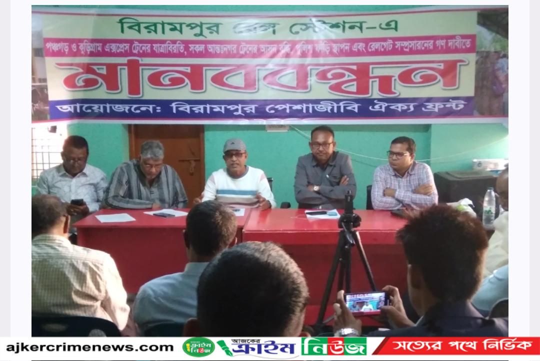 দিনাজপুরের বিরামপুর রেলস্টেশনে আন্তঃনগর পঞ্চগড় এক্সপ্রেস ও কুড়িগ্রাম এক্সপ্রেস ট্রেনের যাত্রাবিরতি, সকল আন্তঃ নগর ট্রেনের আসন বৃদ্ধি, পুলিশ ফাঁড়ি স্থাপন, রেলগেট সম্প্রসারণের গণদাবীতে আগামীকাল বুধবার ১৯ নভেম্বর ২০২৫ সকাল ১০ টায় বিরামপুর রেলস্টেশনে মানববন্ধনের আয়োজন করেছেন বিরামপুর পেশাজীবি ঐক্য ফ্রন্ট।