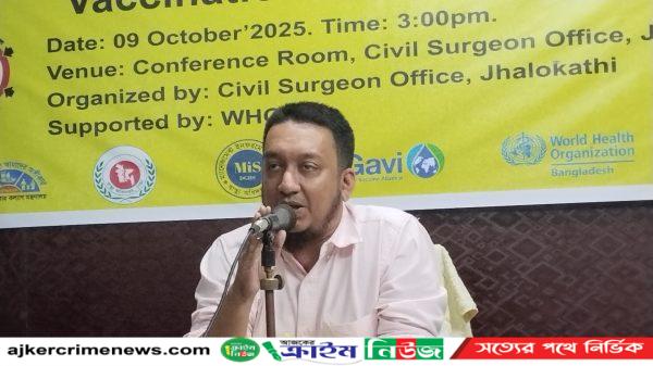 ঝালকাঠি প্রতিনিধি:দেশ ব্যাপী টাইফয়েড জ্বর প্রতিরোধে আগামী ১২ অক্টোবর হতে ৪ সপ্তাহ ব্যাপী সারাদেশে টাইফয়েড টিকাদান ক্যাম্পেইন (টিসিভি) ২০২৫ সাফল্য মন্ডিত করার লক্ষ্যে বৃহস্পতিবার ৯ অক্টোবর বিকেলে ঝালকাঠি জেলা সিভিল বিস্তারিত ...